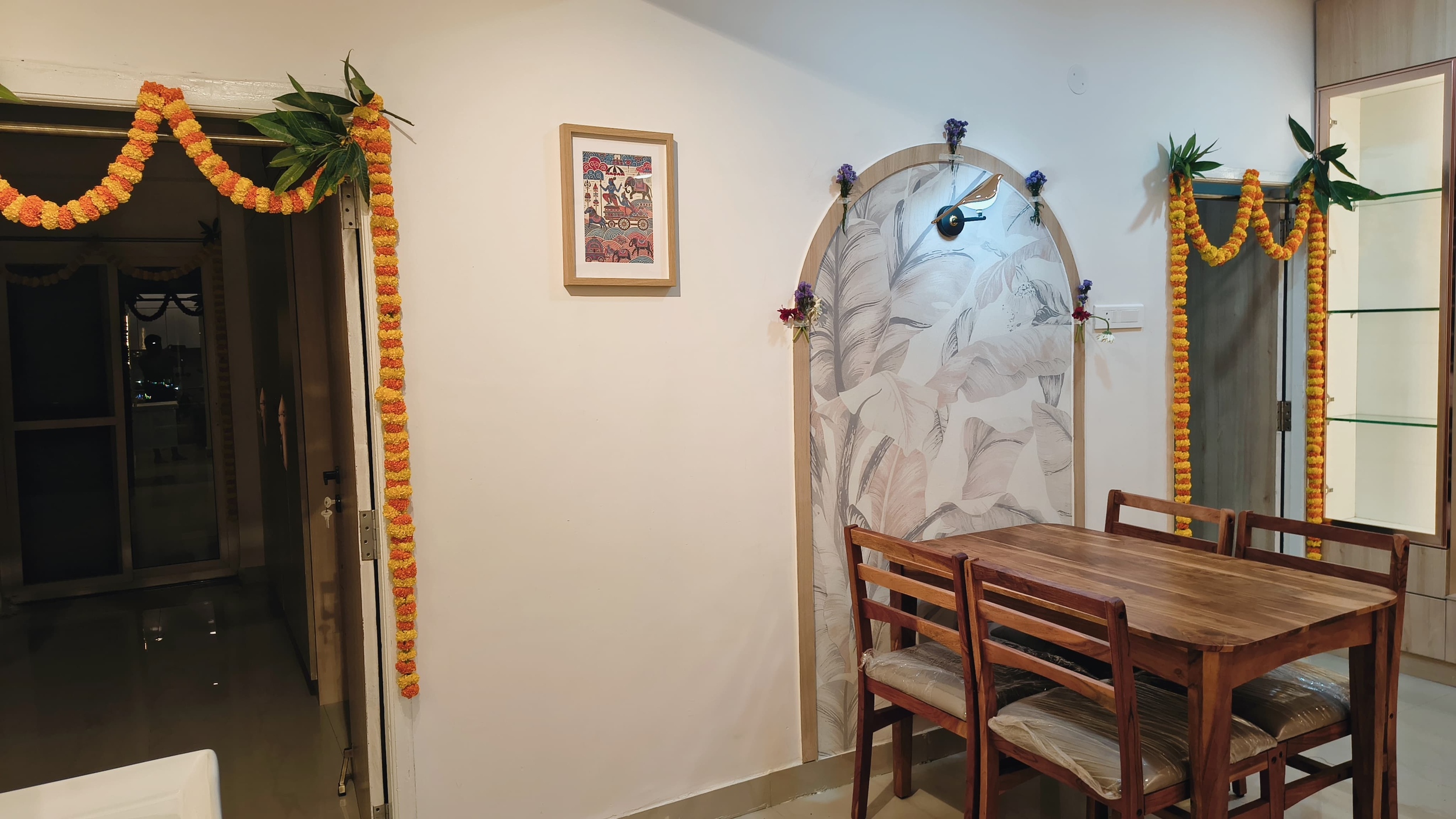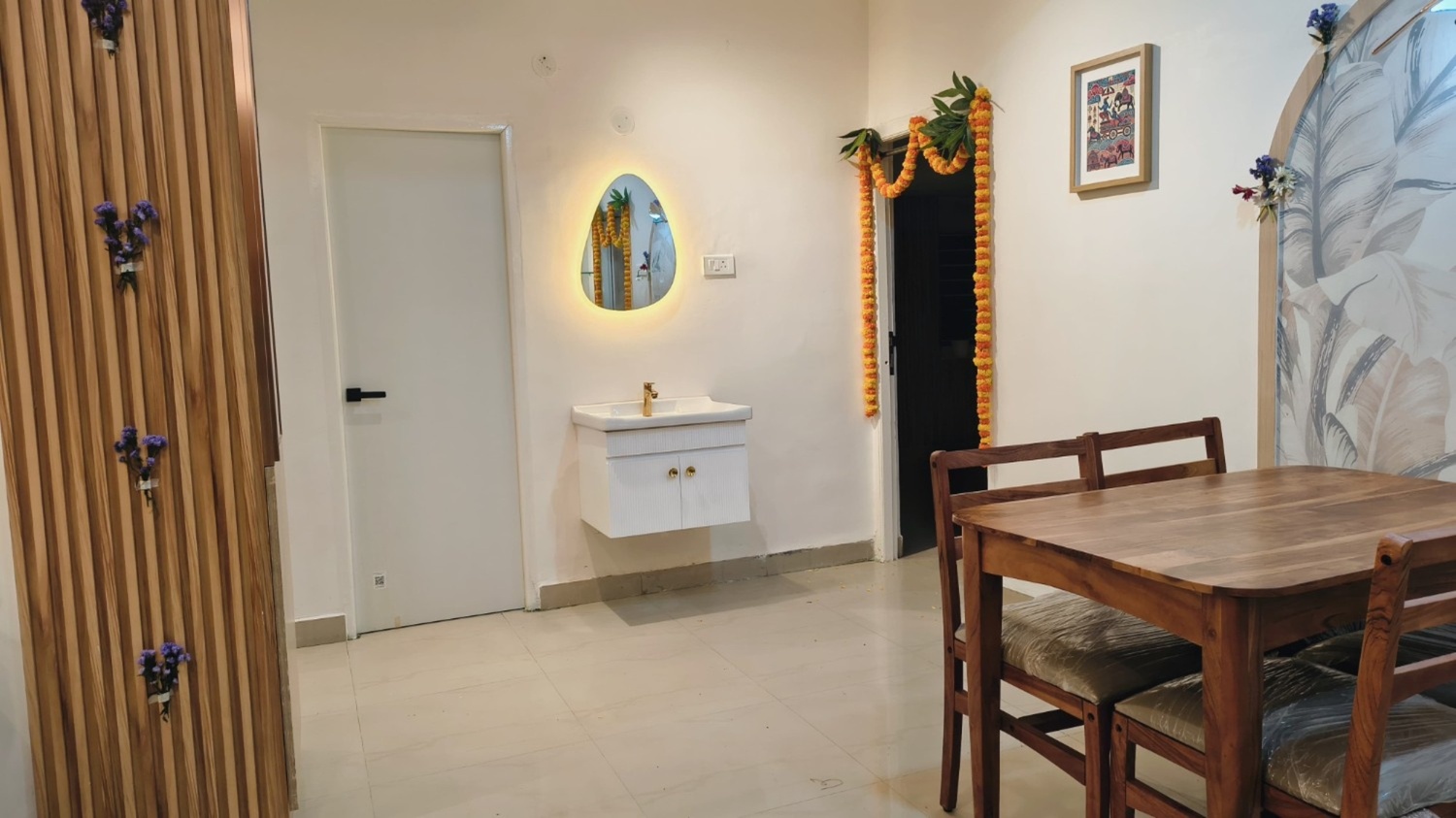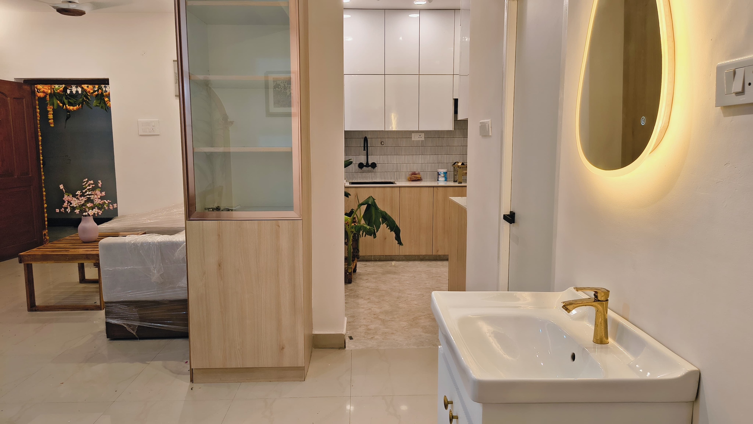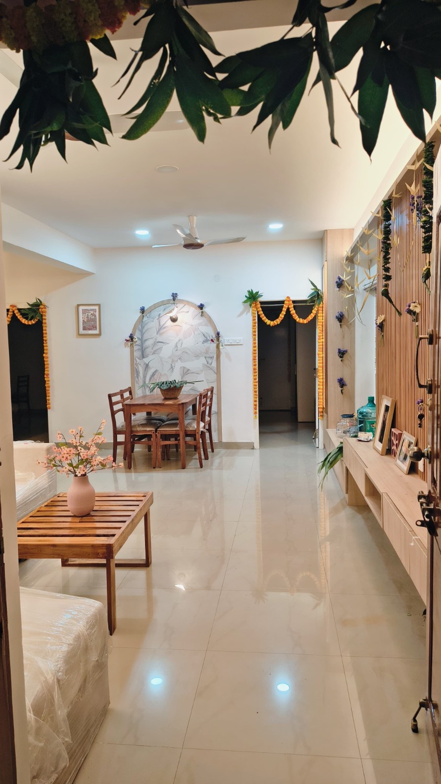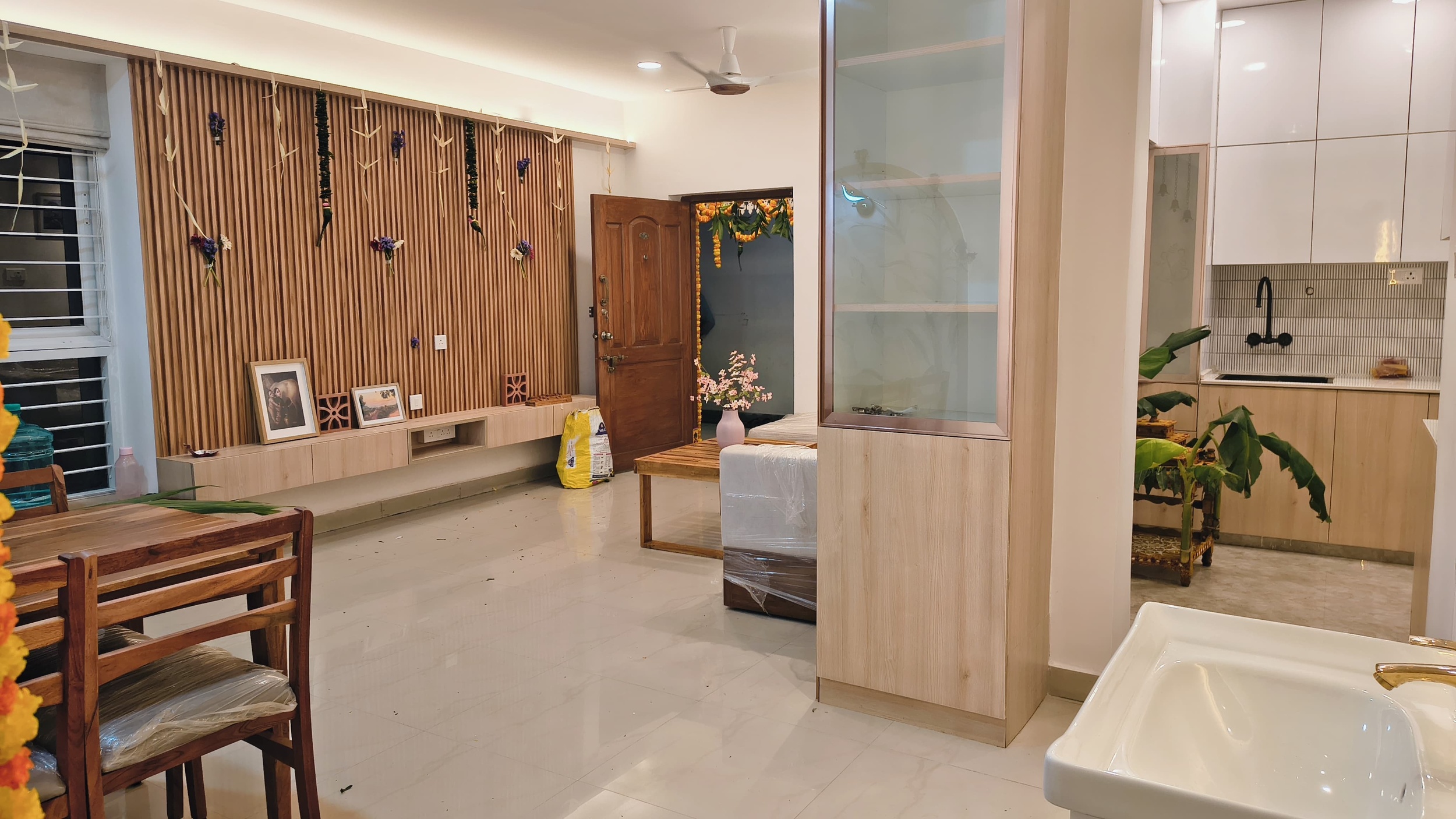 This project was a complete interior renovation of a 2BHK apartment in Hyderabad, transforming it into a peaceful, biophilic-themed sanctuary. The goal was to create a home that helps residents feel connected to nature, promoting a sense of calm and well-being.